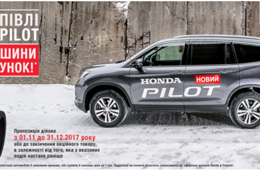 Каждый покупатель внедорожника Honda Pilot, который совершит покупку с 1 ноября 2017 г. по 31 декабря 2017 г., получит в подарок* комплект из 4 зимних покрышек.
