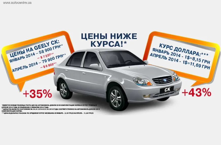 Несмотря на сложную экономическую ситуацию в стране и рост курса доллара к гривне стоимость автомобилей Geely, в частности моделей Geely CК и Geely MК Cross, в долларах снизилась. А в гривнах цена на автомобили поднялась значительно меньше, чем составила девальвации гривны.