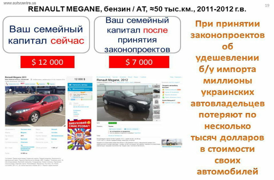 На самом деле такие меры приведут к обнищанию украинских автовладельцев. Ведь если украинский авторынок наводнится дешевыми б/у автомобилями из России или Литвы, то упадут и цены на внутреннем рынке. Например, наиболее популярный на сегодня по ввозу из-за границы подержанный автомобиль Renault Megane, который сегодня стоит 12 тыс. долларов, будет стоить 7 тысяч. То есть если владельцу такого автомобиля нужны деньги сейчас (на участок земли, квартиру, лечение близких, развитие бизнеса), то в случае принятия данных законов он при продаже машины получит почти вполовину меньше, чем сейчас. А ведь чтобы купить «свежий» автомобиль из-за границы, нужно будет сначала продать свой.