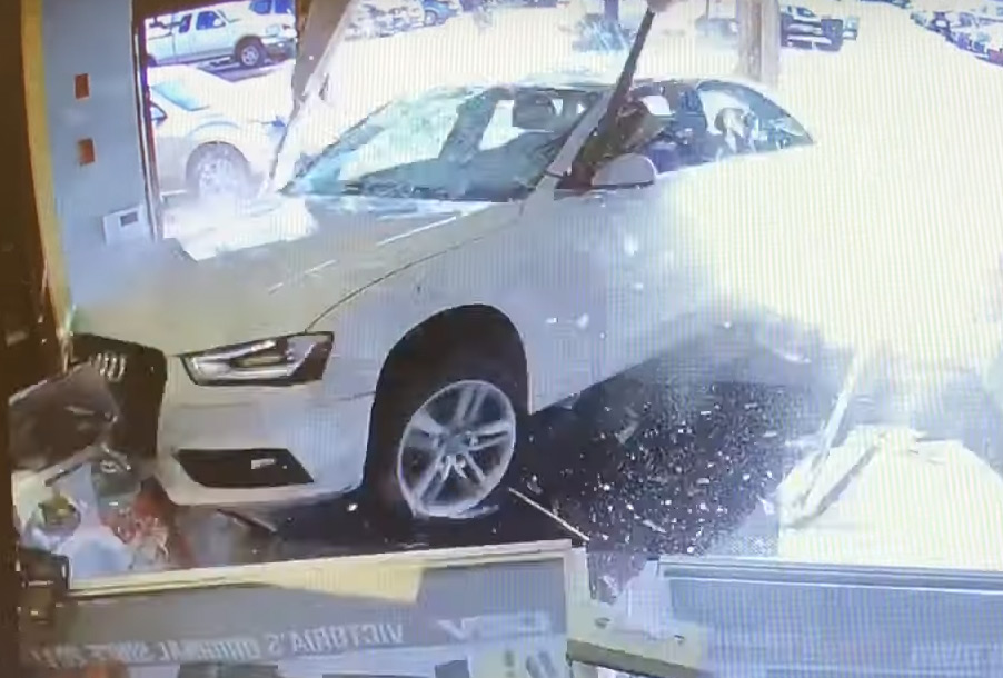 Якщо уважно переглянути відеозаписи з камер спостереження, то на задньому плані можна простежити за розвитком ситуації з самого початку. На перехресті біля маркету Audi A4 неспішно здійснювала поворот, але раптом щось пішло не так. Седан спершу зачепив BMW на зустрічній смузі, а потім не зменшуючи швидкості попрямував просто в магазин, розбивши вітрину і повністю заїхавши всередину приміщення.