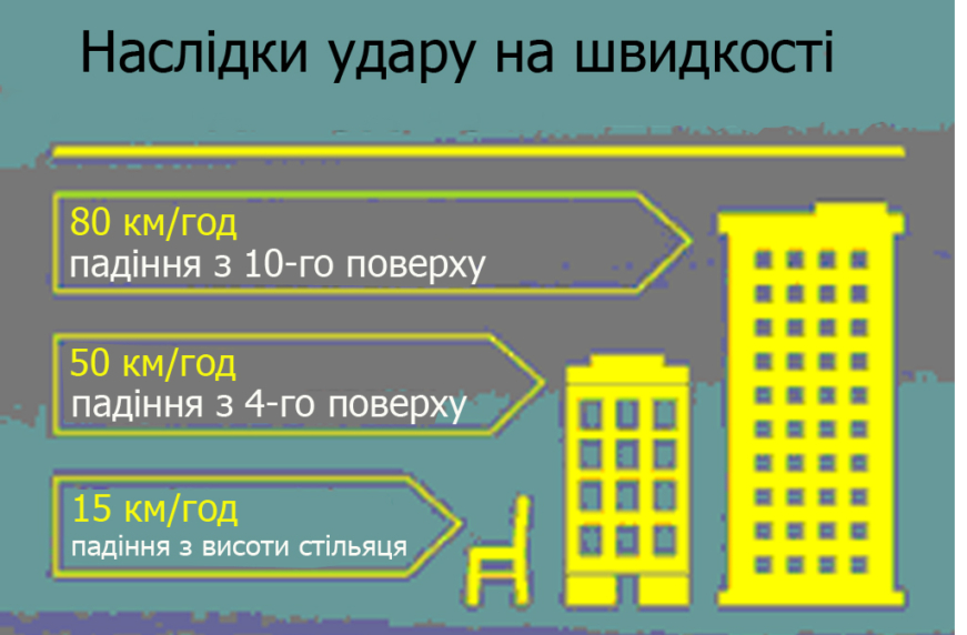 Сучасні автомобілі пропонують людині доволі високий рівень безпеки. Однак у будь-якому разі він також залежить від швидкості, на якій стається зіткнення і існує певний ліміт, після перевищення якого засоби пасивної та активної безпеки транспортного засобу вже не зможуть допомогти. Річ у тому, що людське тіло є сильно вразливим для енергій, що діють на нього у процесі зіткнення. Щоб легше було уявити, що відбувається в подібних випадках, наслідки зіткнення на різній швидкості можна порівняти з падінням людини з певної висоти. Наприклад, удар на швидкості до 80 км/год загрожує наслідками на кшталт падіння людини з 10-го поверху багатоповерхівки!