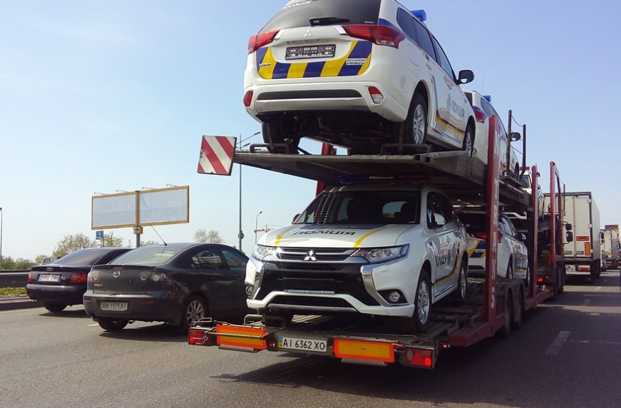 Кореспондент «Автоцентру» зафіксував перевезення гібридних автомобілів Mitsubishi Outlander PHEV для Національної поліції України. Машини рухалися на кількох автовозах Південним мостом столиці в напрямку центру міста.