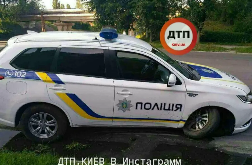 Судячи з фото, у поліцейського Міцубісі Аутлендер пошкоджена передня вісь і вирвано колесо. Офіційно причина аварії поки що не названа, але, найімовірніше, гібрид Mitsubishi потрапив у глибоку яму на дорозі або відкритий каналізаційний люк.