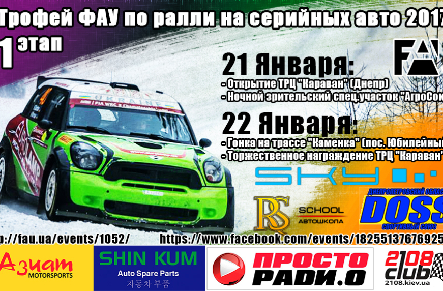 У украинских фанатов ралли не будет времени на расслабление после новогодних праздников. Любителей, равно как и профессиональных спортсменов, ждет 1-й этап Трофея ФАУ по ралли на серийных авто. Чести дать первый старт в 2017 году удостоился Днепр. В ближайшие выходные, 21-22 января, тут пройдет настоящее зимнее ралли!