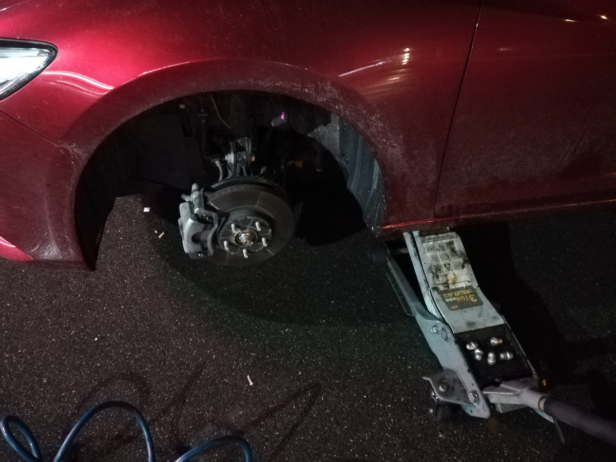 Так и случилось со мной… Даже не успев разогнаться со светофора в начале улицы Богатырской, на путепроводе, тестовая Mazda 6 испытала серьезный удар по передней подвеске. Вспомнив о резине 225/45 R19 сомнений не было – это пробой… Докатившись до обочины я стал третьим в очереди “счастливчиков”. Один вскоре отчалил, другой мужик продолжал возиться с запаской прямо под дождем. Вскоре датчик давления предупредил, что та же процедура ждет и меня. Вот только запасок в современных авто почти нигде нет! Вместо нее – ремкомплект. Который в случае такого пробоя (они обычно боковые) по сути бесполезен. Дорожные службы передают большой привет!