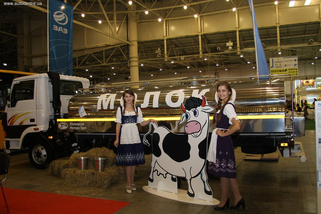 На стенде компании «Юниверсал Моторз Групп» – дистрибьютора грузовых автомобилей ТАТА и автобусов ЗАЗ, входящего в состав Корпорации «УкрАВТО», предложена широкая линейка моделей этих двух марок. Самой востребованной техникой в сфере пищевой промышленности являются молоковозы, предназначенные для транспортировки молока, питьевой и минеральной воды, растительного масла и т.п. Молоковоз, участвующий в выставке, сконструирован на базе шасси TATA LPT 613. Цистерна полезным объемом 3,5 м куб. изготовлена из нержавеющей стали, может на протяжении нескольких часов (даже при температуре воздуха в +35 С) сохранять стабильной температуру перевозимой жидкости.