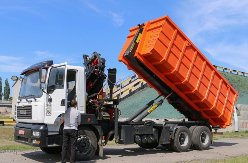 Для более эффективного и быстрого сбора отходов мусоровоз имеет два контейнера вместимостью 26 м куб. Для надежного закрепления кузова 15-тонный крюковой погрузчик имеет задние гидравлические замки кузова.