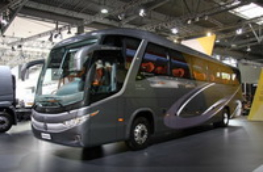 Новинка Marcopolo Paradiso 1200 предстала уже в седьмом по счету поколении. Машина отличается новаторским дизайном – чего только стоят раскосые фары и заваленные назад центральные стойки крыши. В Европе машиной можно было полюбоваться на недавно прошедшем автосалоне в Ганновере. Здесь был представлен автобус с салоном на 36 кресел (шаг сидений – 1060 мм), на шасси MAN с 320-сильным турбодизелем.