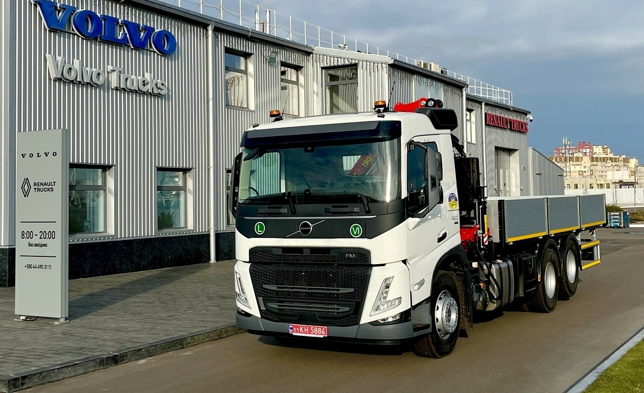 Компанія “Вольво Україна” днями передала клієнту оновлену модель Volvo FM. Тривісне шасі (6х4) на підприємстві «УкрАвтоКомплект» оснастили місткою вантажною платформою та потужним краном-маніпулятором.