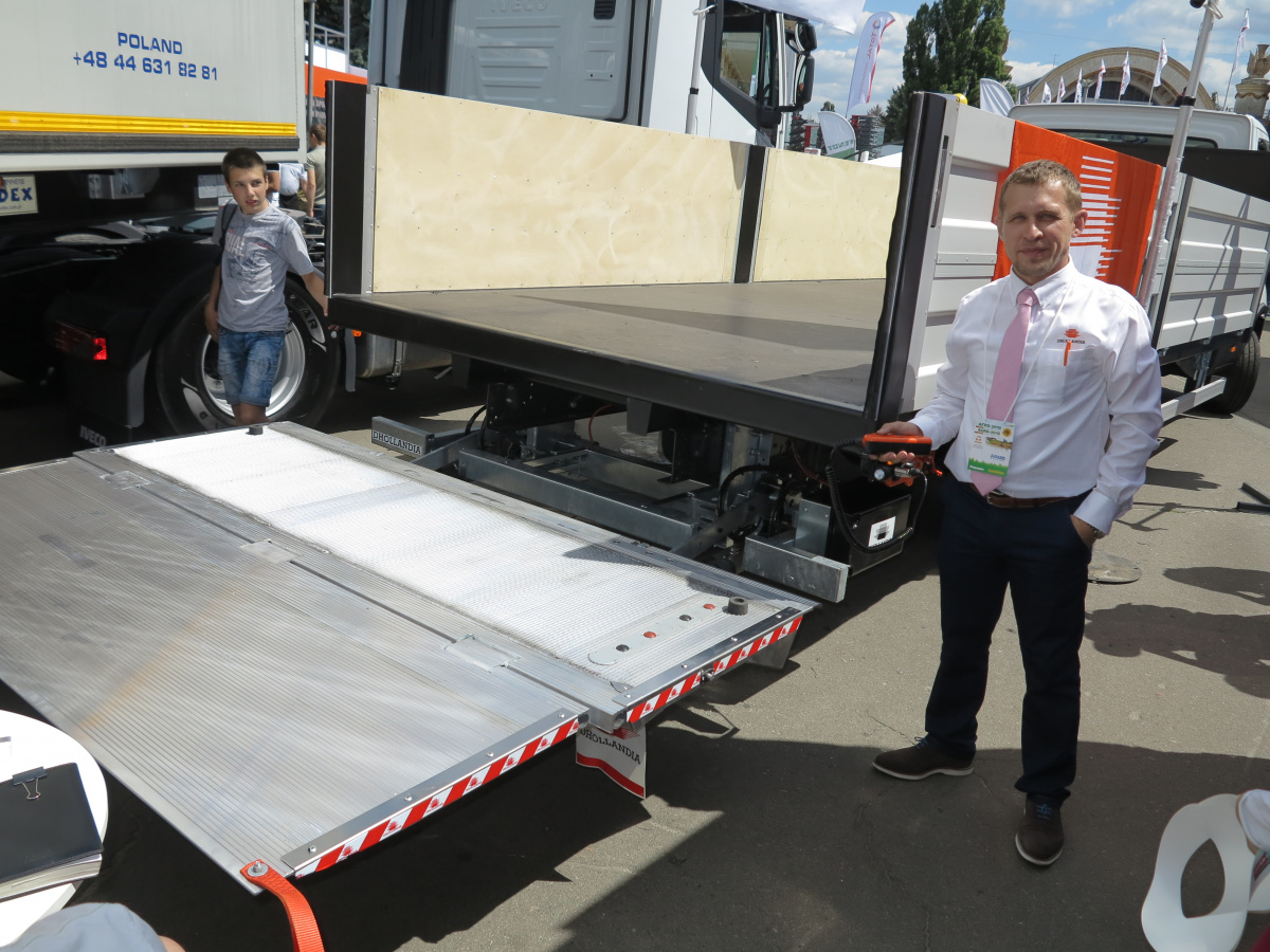 На выставке Агро-2018 в Киеве представлен интересный бортовой грузовик IVECO Daily 70C15, оснащенный раскладным гидробортом марки Dhollandia.