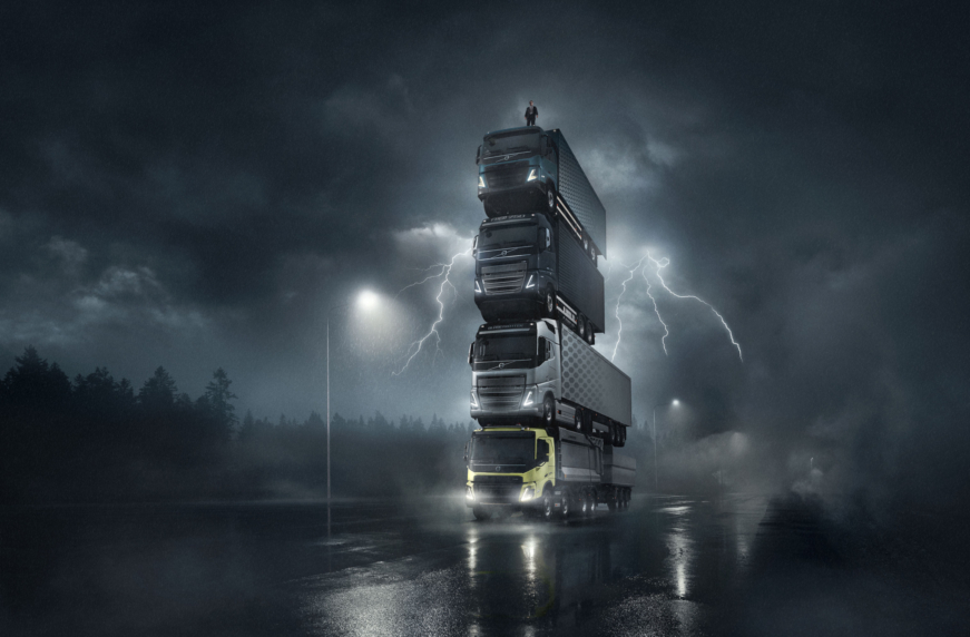 Щоб продемонструвати потужність та міцність своїх чотирьох нових вантажівок, Volvo побудувала колосальну 15-метрову 58-тонну вежу з вантажівок, установивши чотири нові вантажівки одна на одну. Крім цього, на вершині розмістився президент Роджер Альм.