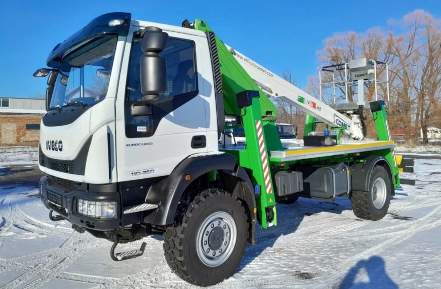 Відзначимо, що автогідропідйомник Comet 19-2-14HQ завдяки невеликій власній вазі може встановлюватися на шасі автомобілів повною масою всього від 3,5 т. Що ж до позашляхового шасі IVECO EuroCargo ML110-250, то воно зроблено з солідним запасом міцності й розраховане на повну масу 11,5 т та вантажопідйомність 5,81 т. Тут встановлено 6-циліндровий турбодизель Tector робочим об’ємом 5,9 л та потужністю 250 к. с., що працює в парі з механічною 6-ступеневою коробкою передач марки ZF. Застосовується тримісна комфортабельна кабіна.