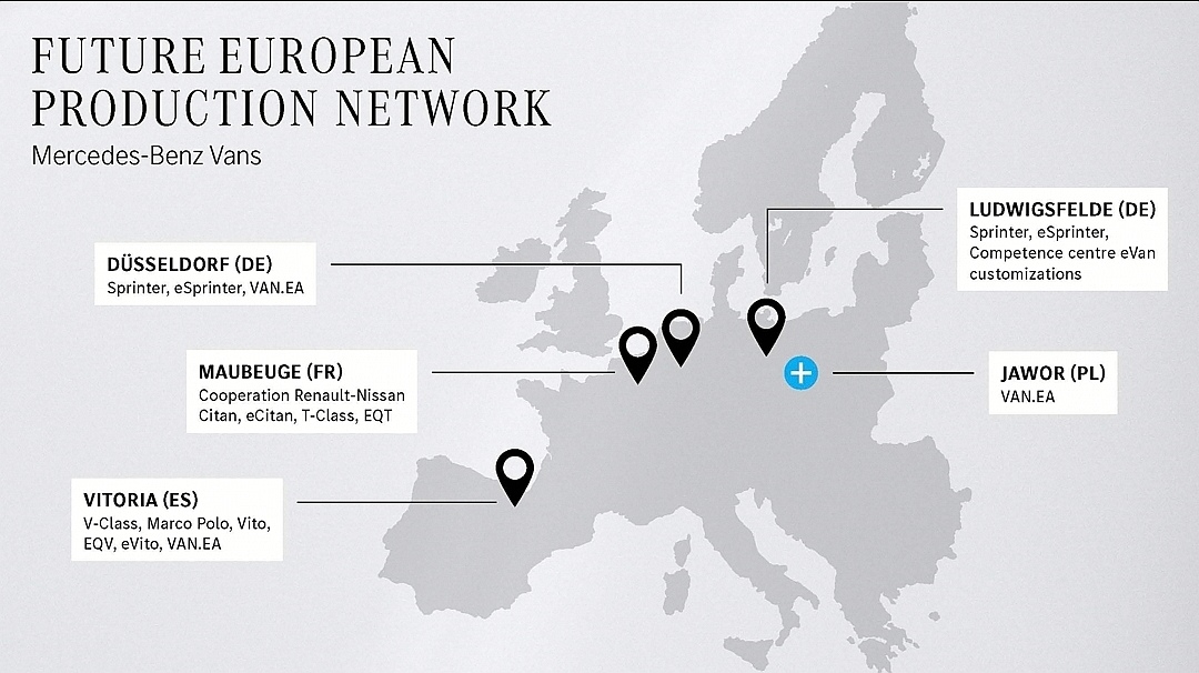 Сьогодні Mercedes-Benz Vans має у своєму розпорядженні три підприємства в Німеччині та Іспанії. Так, у Дюссельдорфі випускають моделі Sprinter і eSprinter (з другої половини 2023 року почнеться випуск електричної моделі наступного покоління). У Людвігсфельді з 2018 року виробляють шасі Sprinter під різні кузови, а з весни 2024 року до них додадуться і машини eSprinter. Що ж стосується іспанського підприємства у Віторії, то тут виготовляють середньорозмірні моделі: V-Class, EQV, а також Vito/eVito, включаючи пасажирські версії Tourer.