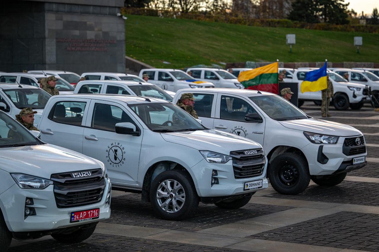 Учора, 4 листопада, у Києві відбулася передача першої партії нових пікапів та міношукачів, які Литва закупила для України в рамках Коаліції розмінування. Загалом планується поставити 230 автомобілів та 240 міношукачів. Як видно по фото, пікапи представлені двох марок – це машини Isuzu D-Max та Toyota HiLux.