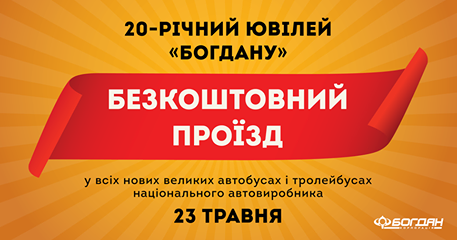 В среду, 23 мая большими автобусами и троллейбусами «Богдан» можно будет пользоваться совершенно бесплатно. Такой подарок пассажирам сделан по случаю 20-летия юбилея марки.