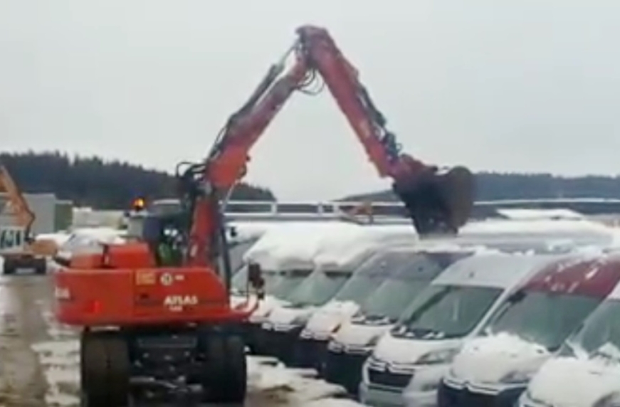 Именно с такой проблемой уборки снега с крыш фургонов Citroen Jumper cтолкнулись на одной дилерской площадке. Сотрудники не растерялись и решили использовать для этой цели… Только не удивляйтесь – два колесных экскаватора.