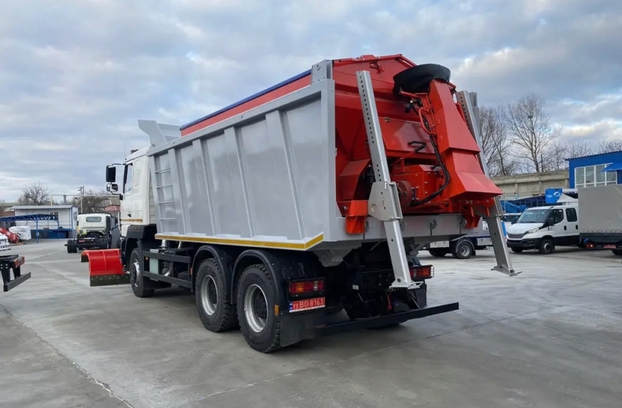 Машина зі змінним обладнанням на базі самоскида оснащена бункером для піско-соляної суміші об’ємом 8,5 куб.м.