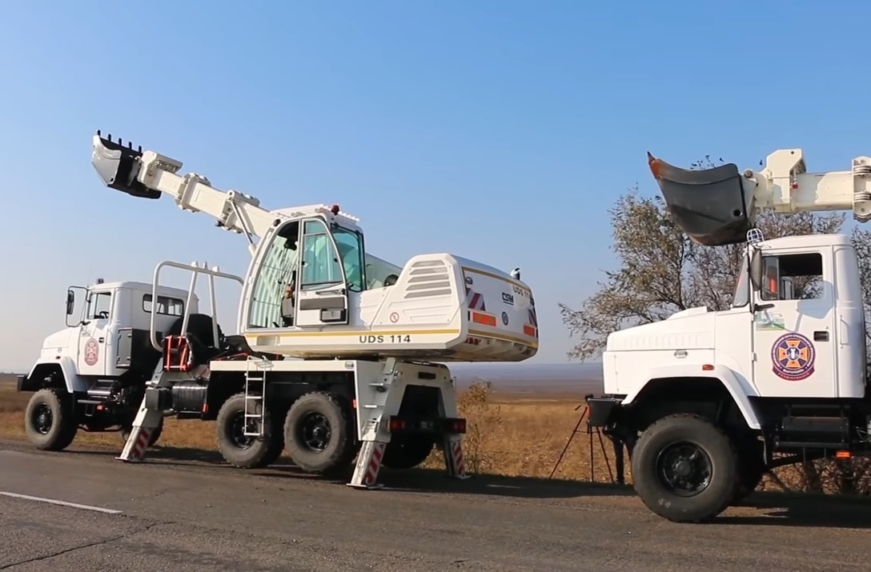 В ходе модернизации и обновления автопарка Главного управления ГСЧС в Донецкой области Аварийно-спасательный отряд получил нынешней осенью три новеньких экскаватора-планировщика. Экскаваторы UDS 114 марки CSM (Словения) установлены на полноприводные шасси КрАЗ-63221 (6х6) украинским Заводом спецтехники «Техкомплект».