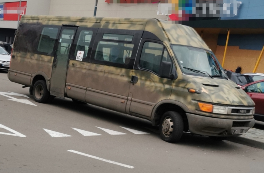 Сьогодні ЗСУ потребують найрізноманітнішого транспорту, у тому числі й в автобусах для оперативного перекидання особового складу. І допомагають їм в цьому пасажирські перевізники, надаючи свій рухомий склад. Днями в Києві вдалося сфотографувати надмістку маршрутку, виконану на довгобазному розвізному фургоні IVECO Daily. Привертають увагу врізані другі, повністю засклені пасажирські двері.