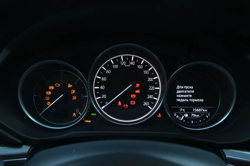 Остальные решения знакомы: щиток приборов с тремя круглыми аналоговыми приборами в индивидуальных колодцах; удобные и логичные блоки управления климат-контролем и мультимедийной системой MZD Connect; клавиши электрического стояночного тормоза; ручка управления громкостью аудиосистемы на напольной консоли.
