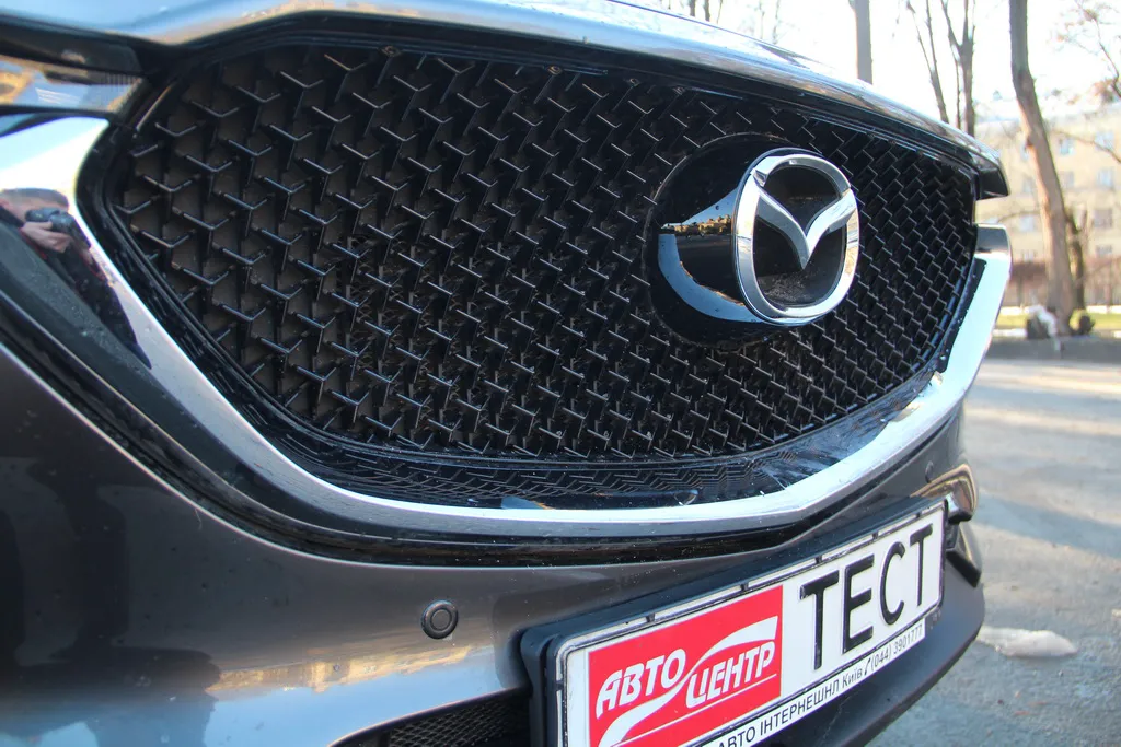 Больше всего новая Мазда СХ-5 впечатлила меня передней частью. Панель кузова перед капотом, словно козырек, нависает над выразительными фарами головного света и огромной пастью решетки радиатора с заметно выступающей эмблемой.