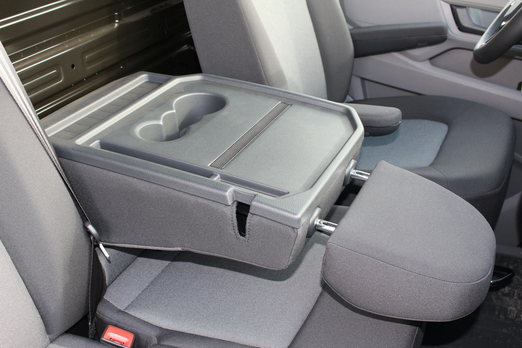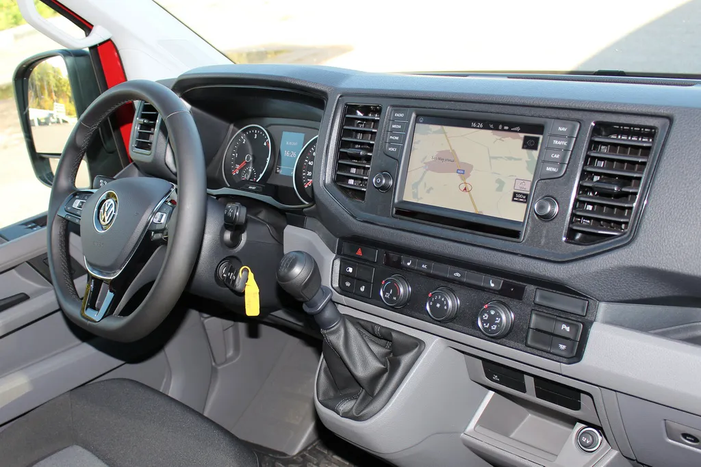 Знакомая передняя панель от Volkswagen Т6 Transporter явно более узкая, чем кузов Крафтера. Поэтому торпедо словно уложили на более широкий подиум с открытыми полками и подстаканниками.