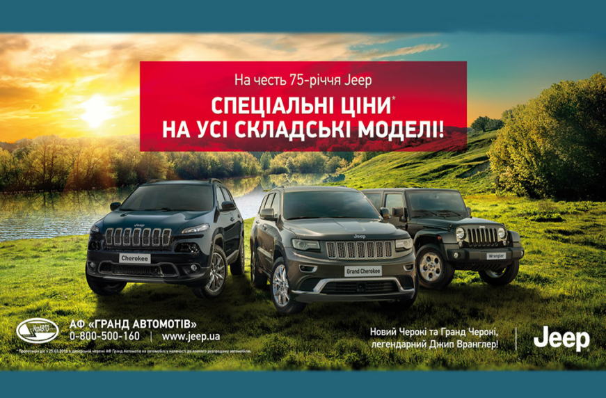 В честь особенного юбилея бренда Jeep, официальный импортер компания Гранд Автомотив, объявляет специальные цены на складские модели Jeep Cherokee, Jeep Grand Cherokee и легендарный Jeep Wrangler!
