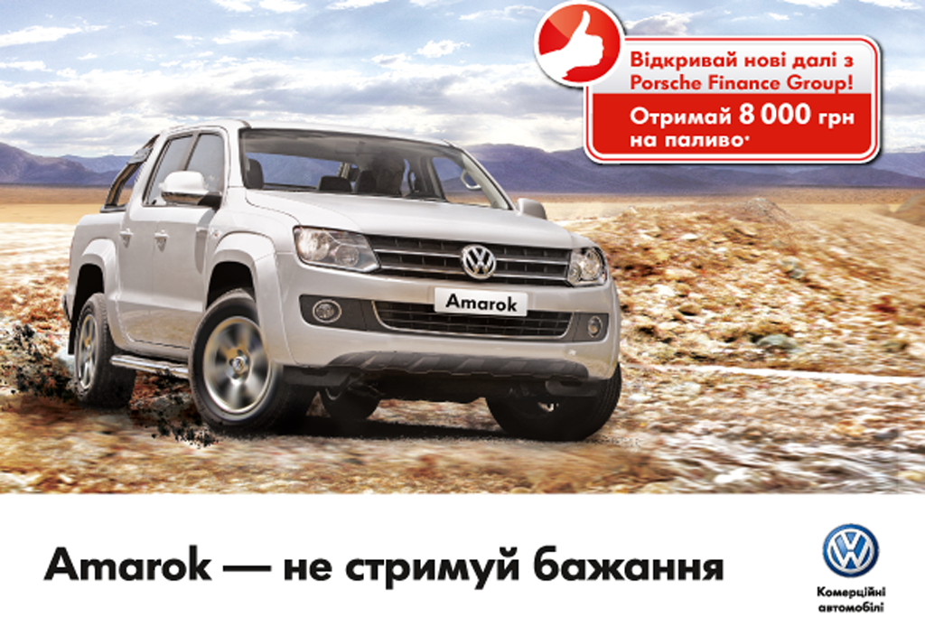 Porsche Finance Group совместно с официальным импортером автомобилей Volkswagen ООО «Порше Украина» приготовили для украинцев настоящий подарок* - топливную карточку номиналом в 8000 грн каждому покупателю автомобиля Volkswagen Amarok с финансированием от Porsche Finance Group.