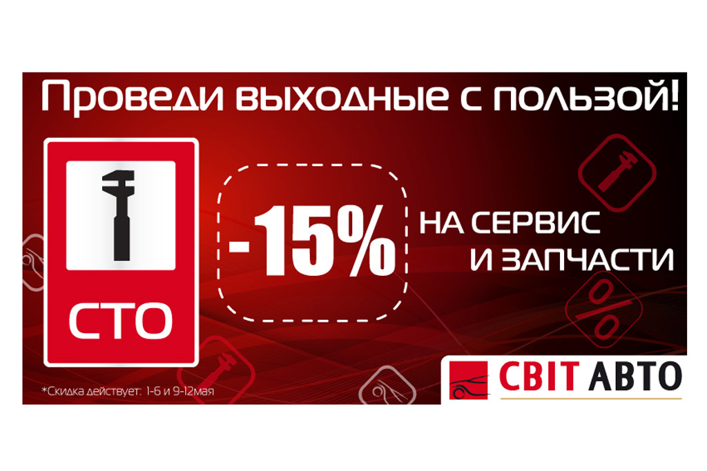С 1 по 12 мая (исключение 7 и 8 число), обслуживаясь на сервисе «Свит-Авто» Вы гарантировано получите скидку в 15% на весь перечень работ, а также запасные части. Не откладывайте заботу о Вашем автомобиле на потом, ведь обсуживаться в выходные приятней – и времени больше, и цены ниже. Подробности – у Вашего сервисного консультанта.