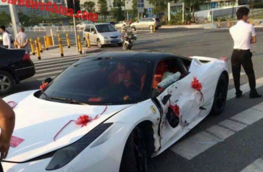 Это происшествие произошло в Китае, где состоятельные молодожены часты арендуют дорогие спортивные машины и организовывают свадебные кортежи с суперкарами. Но на сей раз свадебная Ferrari 458 даже не доехала к дворцу бракосочетания.
