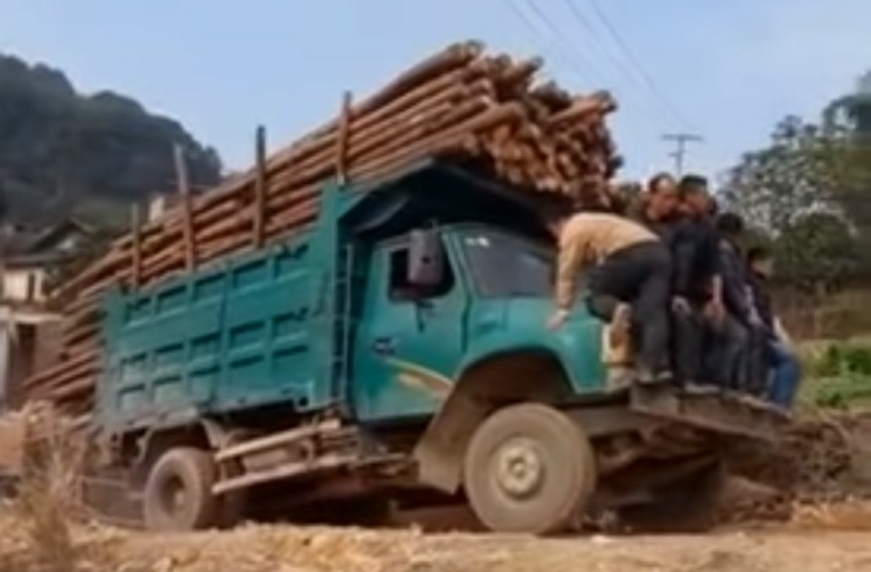 Очевидцы записали на видео аварию с грузовиком, сильно перегруженным бревнами. Стоит отметить, что для развивающихся стран нет ничего необычного в том, чтобы пренебрегать техникой безопасности. Как только в кадре появляется грузовик, на капоте которого с относительным комфортом расположилось несколько человек, стало ясно, что все закончится не очень хорошо.