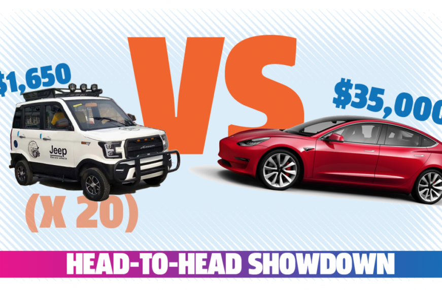 Журналисты издания Jalopnik решили сравнить популярный электрокар Tesla Model 3, который в «базе» стоит 35 000 дол., с двумя десятками китайских электромобилей Furkika Fur-RAPTORs по цене всего $1 650 за штуку.
