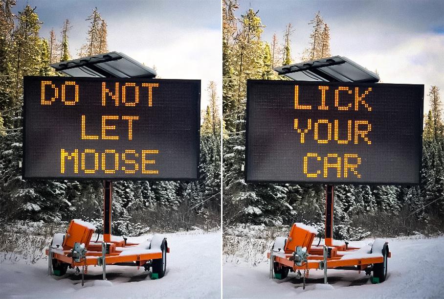На дорогах Канади з’явився цікавий знак, що закликає остерігатися диких лосів, що лижуть автомобілі. Їхня популяція зросла так сильно, що тварини не соромляться виходити на траси і облизувати припарковані машини. Місцева влада вважає нові звички тварин надзвичайно небезпечними.