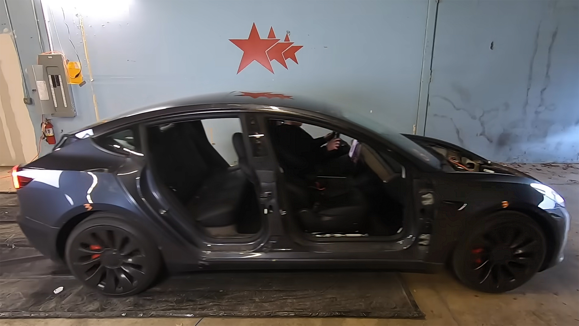 Наступним етапом стали двері. Спочатку прибрали задні. Автомобіль продовжував їхати. Потім Tesla Model 3 позбавили передніх дверей, але електроніка все ще не реагувала. В результаті експерименту седан полегшав приблизно на 227-318 кг, але бортовий комп’ютер цього не помітив.