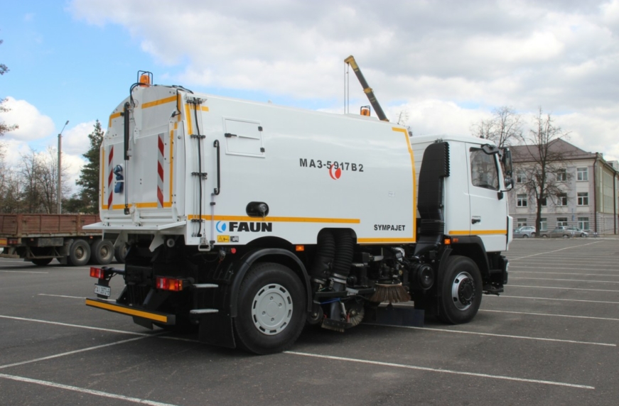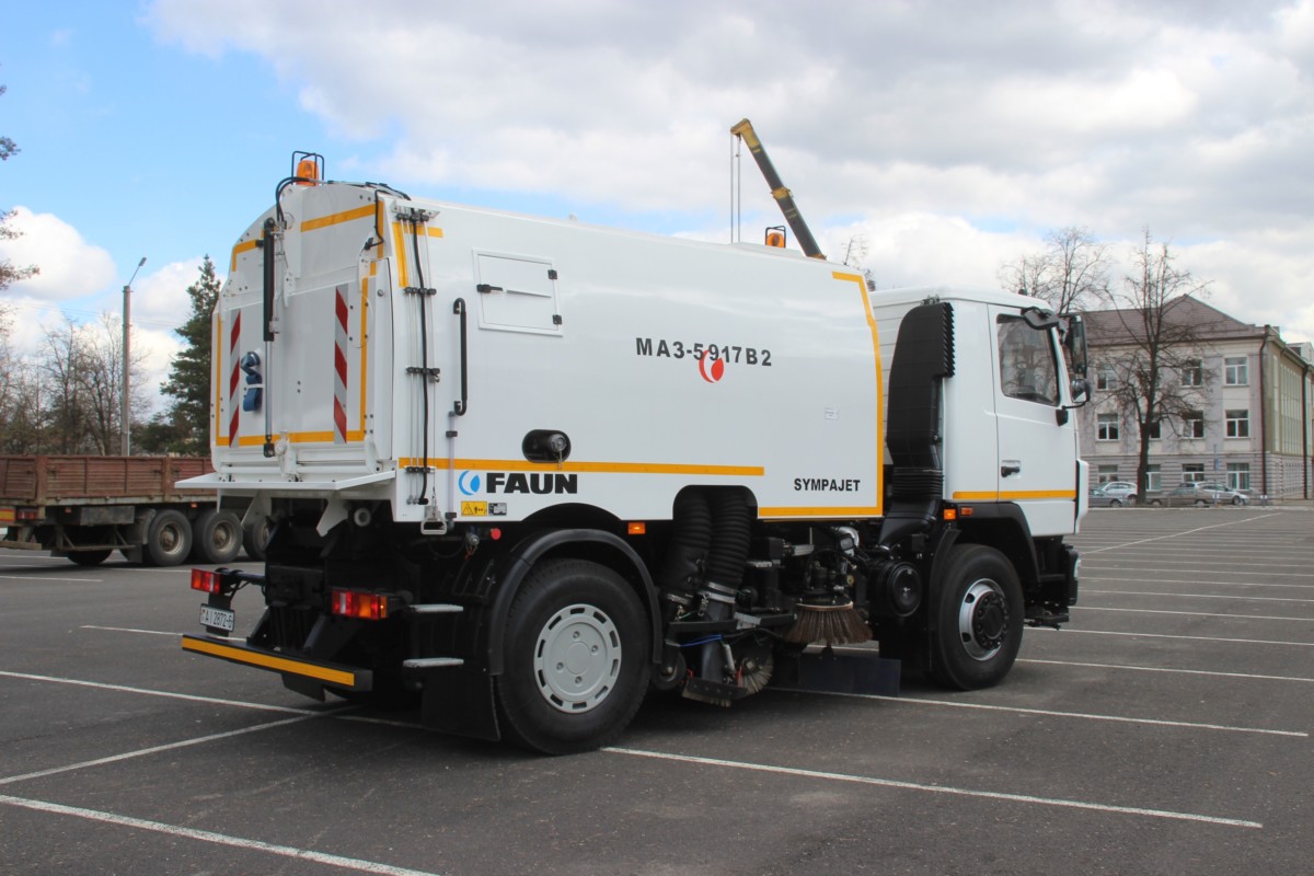 Подметально-уборочную машину МАЗ-5917В2-F10 презентовали на форуме по управлению отходами «WasteTech-2017». На шасси МАЗ-5340B2 установили передовое немецкое оборудование марки FAUN. В результате «мега-пылесос» практически не имеет аналогов в СНГ. Всего одна такая машина способна заменить несколько более устаревших единиц спецтехники.
