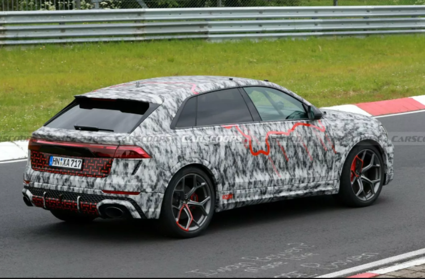 Увагу шпигунів привернув камуфляж, виконаний у забарвленні Нюрбургрингу, але не він один. Зміни у кросовера також суттєві. Так, рестайлінговий RS Q8 отримав більш виразну передню частину з іншою решіткою радіатора та більш спортивним бампером зі збільшеним повітрозабірником. Ще видно фари з тоншими ДХО та задні ліхтарі зі зміненою графікою. Задній бампер отримав новий стоп-сигнал.