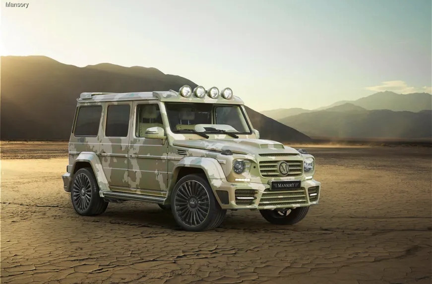 Весной на автошоу в Женеве компания Mansory презентовала оригинальную версию внедорожника Mercedes-Benz G63 AMG в армейском камуфляже. Часть кузовных панелей изготовлены из карбона, а за счет широченных колесных арок машина стала на 80 мм шире стандартного G63 AMG. Помимо этого на крыше установили комплект из четырех мощных прожекторов. Массивные 22-дюймовые легкосплавные диски «обуты» в резину размерности 305/35. Салон украшен кожей и алькантарой с декоративным орнаментом.