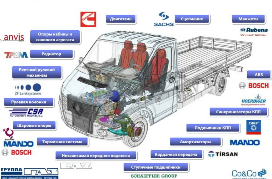 В конструкции «Газель Next» применяются многочисленные комплектующие производства зарубежных компаний с мировым именем. Но сделано это выборочно, если не сказать – точечно. Их используют в самых ответственных узлах, там, где малейшая вероятность отказа приведет к снижению надежности автомобиля в целом. Полное представление о широте «импортного набора» компонентов для новинки ГАЗа дадут представленные здесь схемы. В то же время, никто не отменял стремления максимально снизить себестоимость автомобиля.