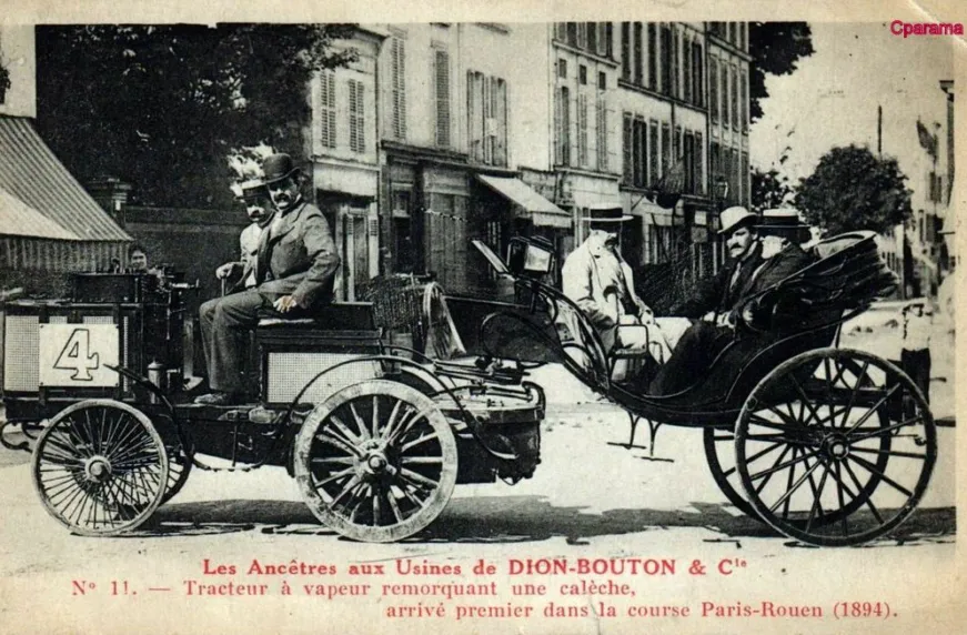 Альбер Де Діон (на фото праворуч) та Жорж Бутон на одному з перших автомобілів власної розробки (1899 р.)