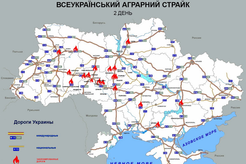 На данный момент уже заблокирован ряд дорог в Винницкой (Комсомольск, Вороновица, Орехов, Дьяковцы), Хмельницкой (Войтовцы), Киевской (Белая Церковь, Володарка, Ставище), Ровенской (Дубны, Корец), Черниговской (Копти) областях. На Хмельнитчине перекрыли трассу на Львов. Также сообщается о блокировании трасс в районе Каменец-Подольского и Бобринця на Кировоградщине.