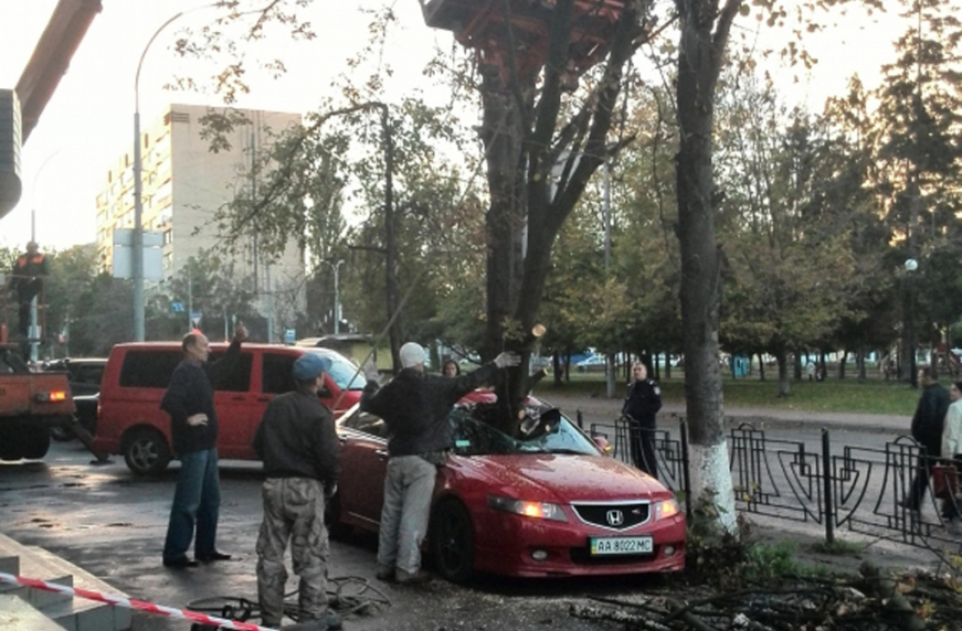 Первыми на место ЧП приехали сотрудники «Киевзеленстроя». Они огородили все ленточкой и стали дожидаться милицию, которая приехала через полтора часа. После того как был оформлен акт, коммунальщики с помощью бензопил срезали ветки и вытащили ствол из машины. Хозяин рассказал, что внутри очень сильно повреждена панель управления и торпеда.