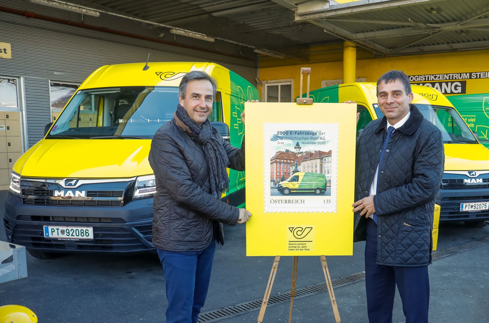 Мер Граца Зігфрід Нагль (ліворуч) і Петер Умундум, виконавчий член правління з питань посилок і логістики Österreichische Post AG, під час церемонії вручення персоналізованої поштової марки на честь 2000-го електромобіля в парку Österreichische Post.