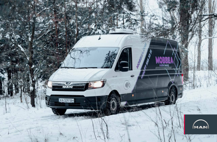 Это первый мобильный салон красоты Mobbea, который создали прямо в развозном фургоне MAN TGE 3.140. Для этого использовали один из самых вместительных его вариантов – длиннобазный, с высокой крышей (L4H3) – с полезным объемом грузового отсека 14,4 м куб. При габаритной длине 6,8 м и высоте 2,59 м полная масса составляет 3,5 т. В движение машину приводит 140-сильный турбодизельный двигатель.