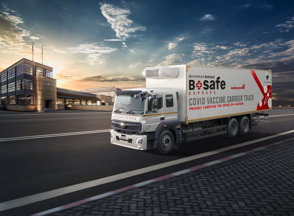 Предприятие Daimler India Commercial Vehicles (DICV) показало специализированный рефрижераторный грузов BharatBenz "BSafe Express", предназначенный для безопасной транспортировки вакцин от COVID-19