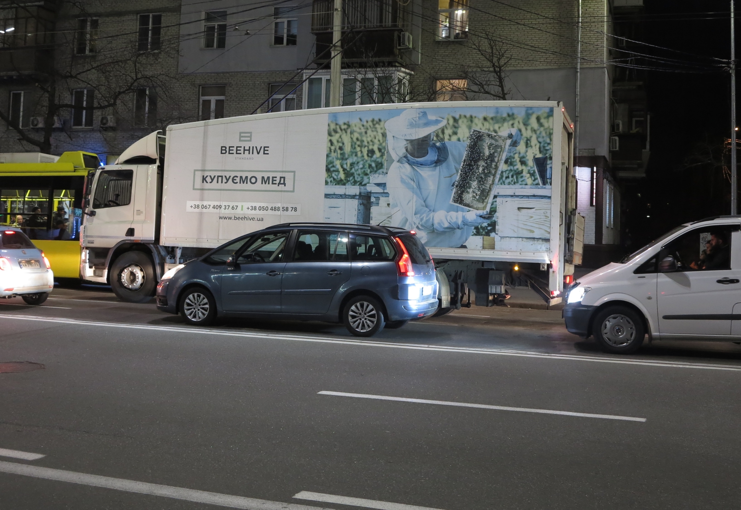 Напевно, мало, хто в Україні бачив щось подібне, а саме – вантажівку для перевезення меду. Відмітною рисою представленого на фото DAF CF75 є кузов-фургон з дуже похилим дахом, який спадає до кабіни і стає вищою ближче до корми вантажівки. Таке рішення суттєво зменшує аеродинамічний опір, що дає змогу добре заощадити на паливі.
