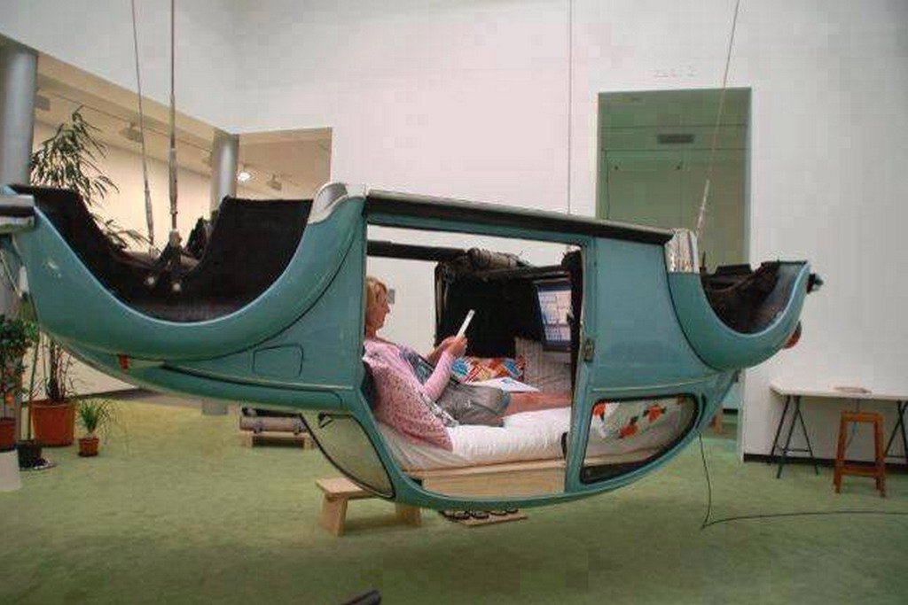Казалось бы, как увековечить свой любимый автомобиль? Конечно, если место позволяет его можно бережно хранить в ангаре. А если нет такой возможности или, допустим, машина уже частично разобрана? Выход есть – нужно сделать из нее что-то полезное. Вот несколько примеров как владельцы своих машин или просто фанаты той или иной модкли, доставшие их компоненты, превратили любимцев в предметы, так необходимые в повседневной жизни. Наверное, самый забавный – это кузов легендарного Volkswagen Beetle, в котором сделали спальню кровать. Но это еще не все кузов при этом перевернули вверх дном и подвесили к потолку (см. фото в заголовке).