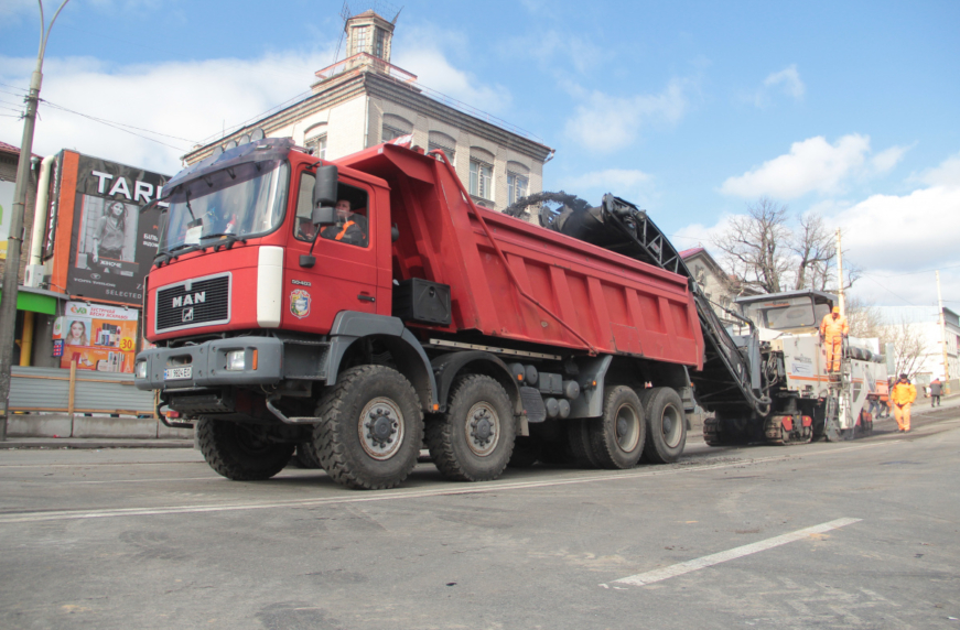 А пока на мосту работает фреза по асфальту Writgen на четырех гусеницах. Что же касается автотехники, то здесь можно увидеть несколько самосвалов повышенной грузоподъемности. Среди них грузовики MAN 50.403 и 19.403 – колесной формулы 8х8 и 8х4 соответственно. Они оснащены кузовами увеличенного объема. Эти машины, судя по наклейкам на дверях, приехали из Борисполя. Также по вывозу старого асфальта работает и четырехосный самосвал Scania 124 C420 с огромным кузовом с арабскими надписями на нем.