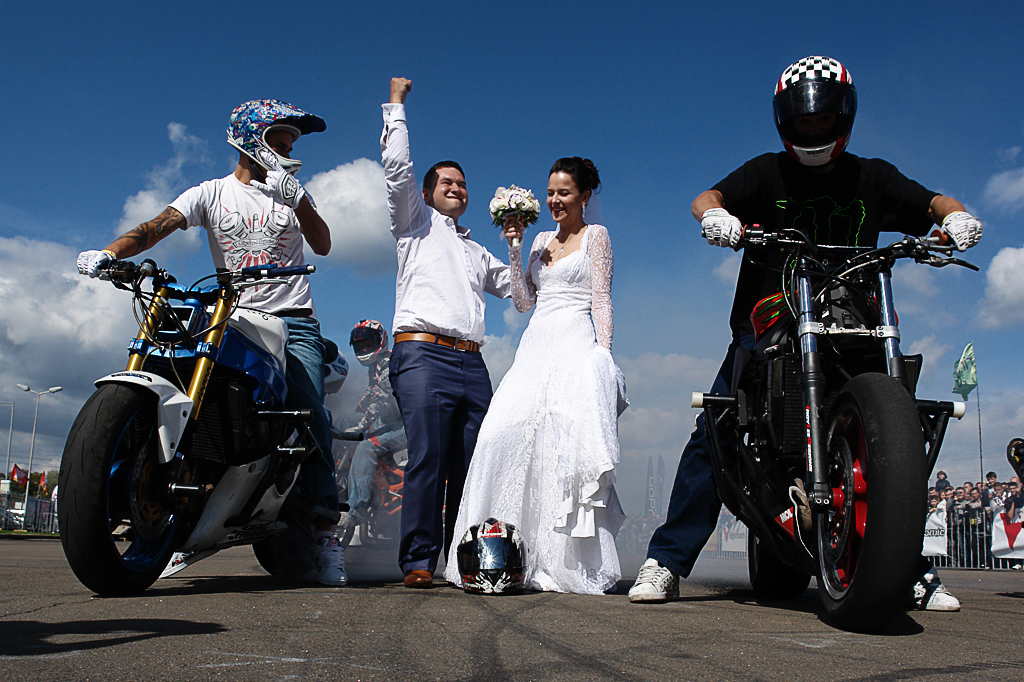 Но одними трюками сорвиголов на мотоциклах программа чемпионата по стантрайдингу не ограничилась. Сегодня весь день на площадке Столичного Автошоу происходило настоящее празднество для молодых телом и духом, а именно – выступления музыкальных коллективов, танцоров в стиле брейк, разнообразные конкурсы для зрителей, участников (самый красивый скутер) и даже… стантерская свадьба! Молодожены Владимир и Елена просто искрились счастьем, находясь в самом эпицентре мотофестиваля, когда вокруг них кружили на одном заднем колесе профессиональные мототрюкачи.