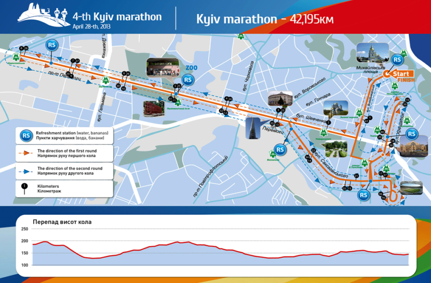 Киевский международный марафон, который уже в четвертый раз будет принимать у себя столица Украины, стартует в 9 утра 28 апреля и пройдет по маршруту от Михайловской площади по улице Владимирская, бульвару Тараса Шевченко, проспекту Победы до станции метро «Берестейская» и обратно до площади Победы, после чего свернет на улицы Саксаганского и Красноармейскую и через Крещатик с разворотом на Европейской площади возвращается на Владимирскую улицу и Михайловскую площадь. Соответственно, по всем перечисленным городским артериям, а также на подъездах к ним, движение транспорта будет перекрыто или ограничено.