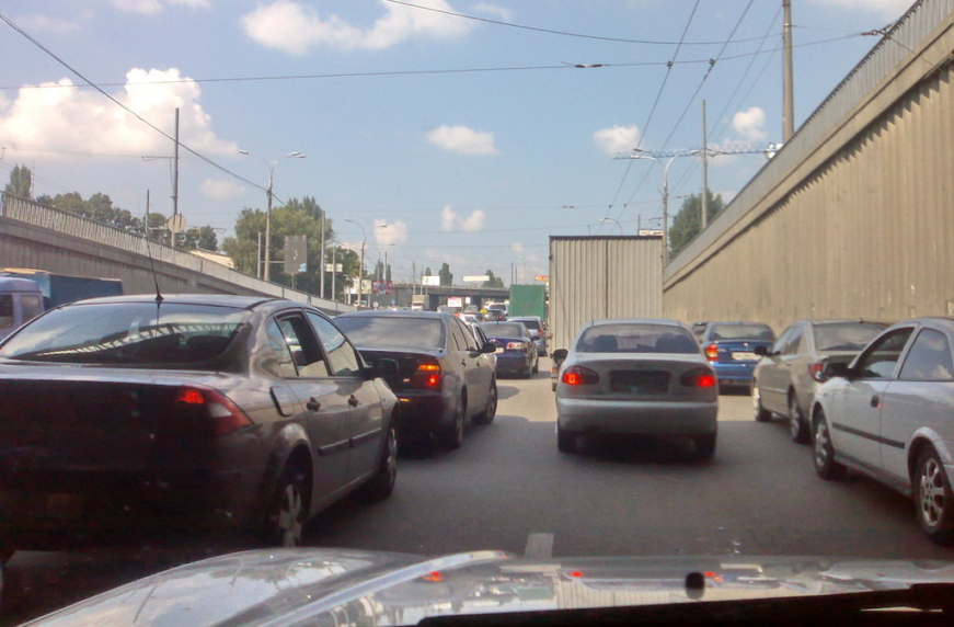 Всему виной – 8-метровая яма на ул. Телиги. Напомним, там в субботу после очередного ливня провалился асфальт на полосе в сторону Шулявки. Для ремонта направление полностью перекрыли, и в итоге полностью закупорились Оболонь, Петровка, Троещина и Подол, через который злосчастную дыру и объезжали. Всех, кто подъезжал со стороны Петровки к ул. Телиги, сотрудники ГАИ отправляли на объезд через ул. Фрунзе, по Петропавловской (кстати, там уже официально двухстороннее движение), Бакинской и Ольжича.